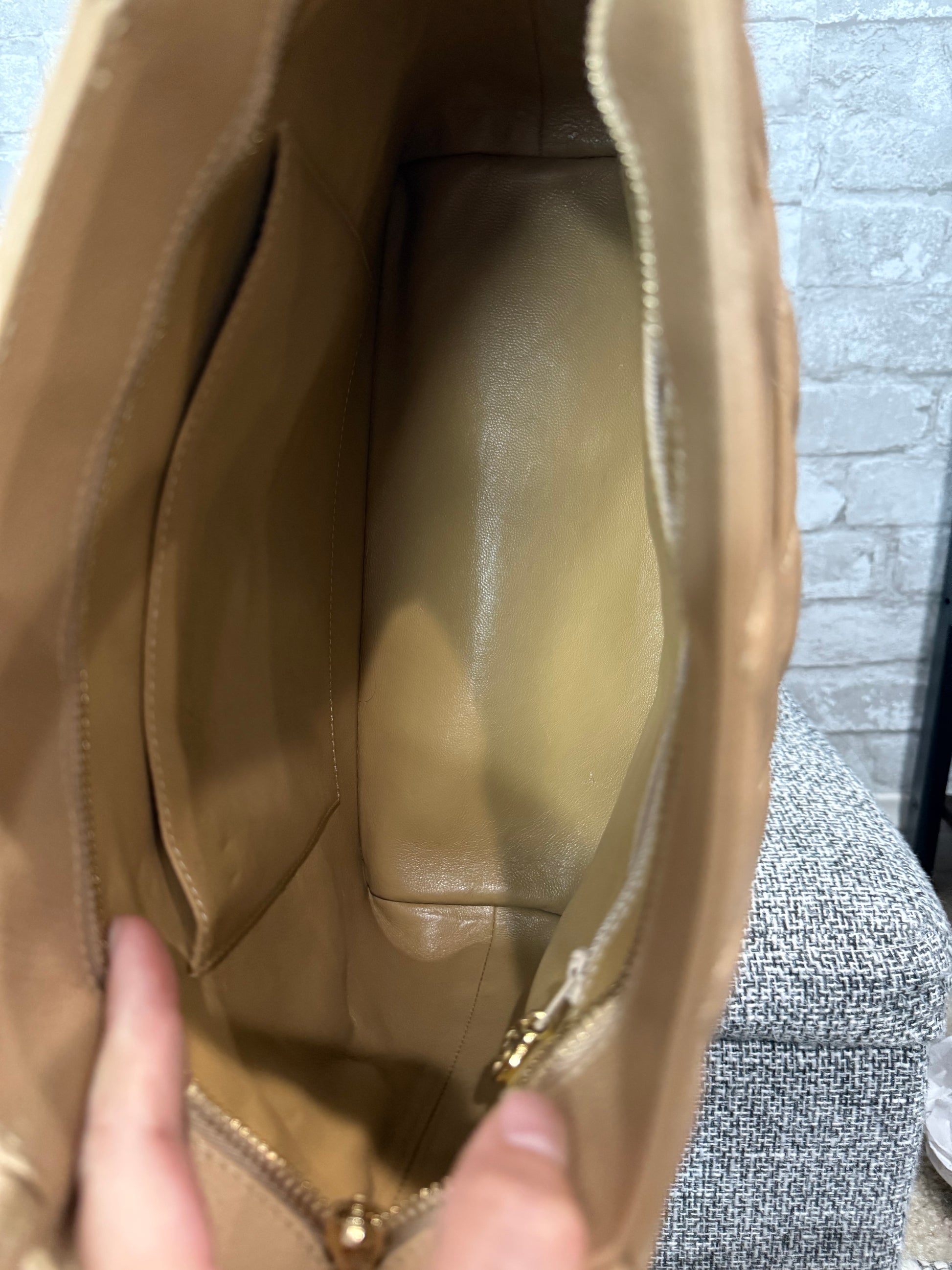 • Interior: Leather lining with one zip pocket and one slip pocket