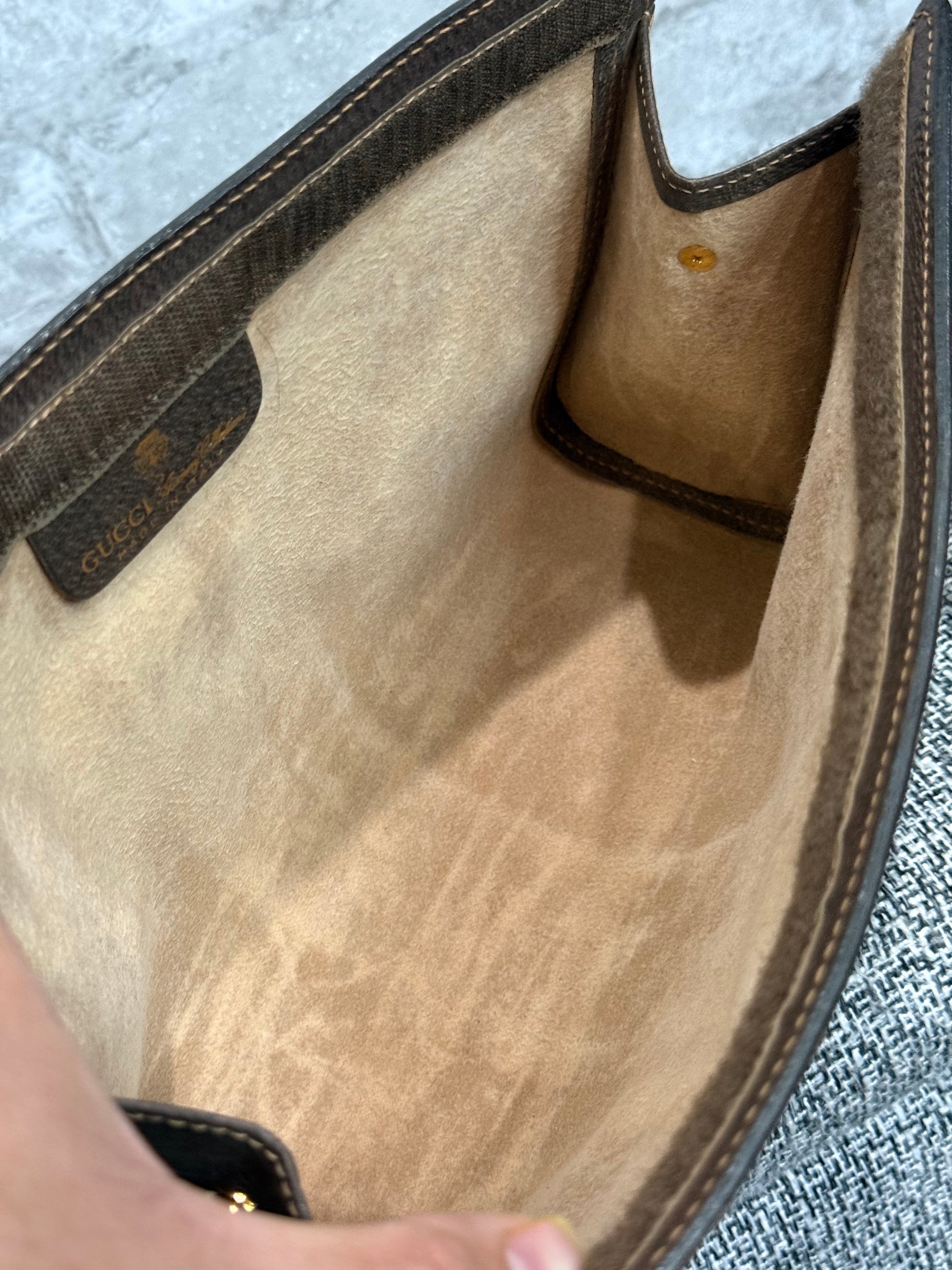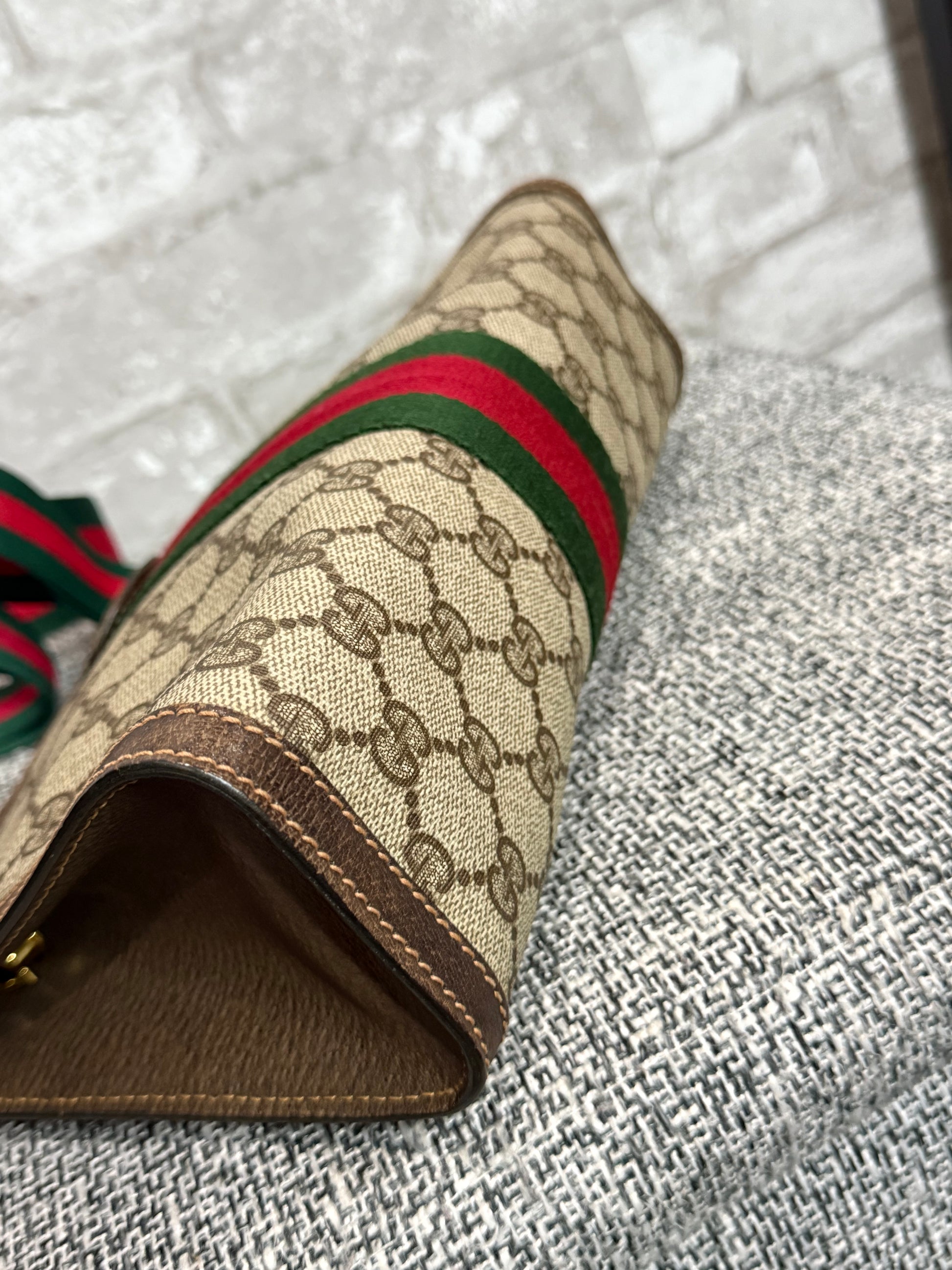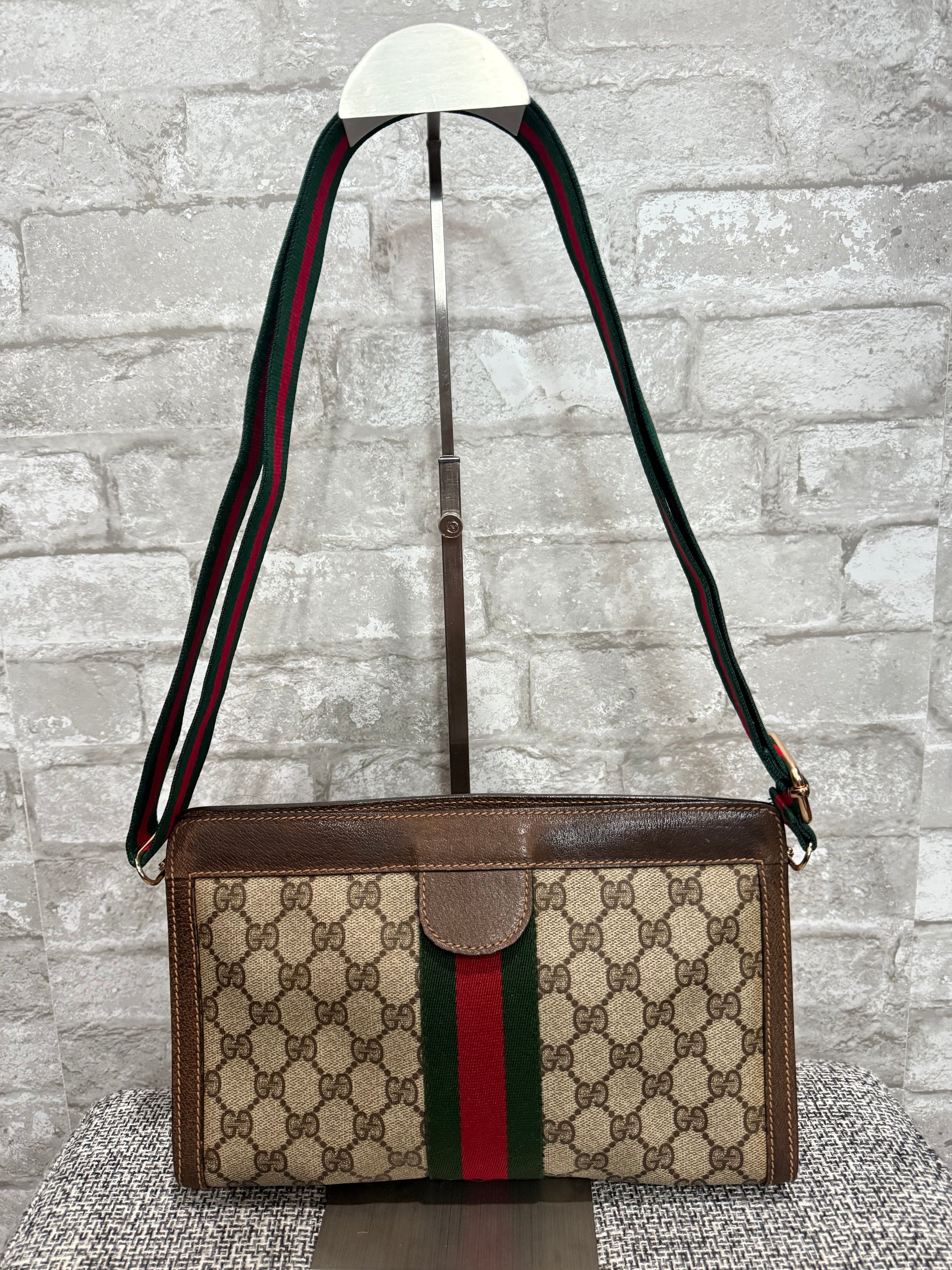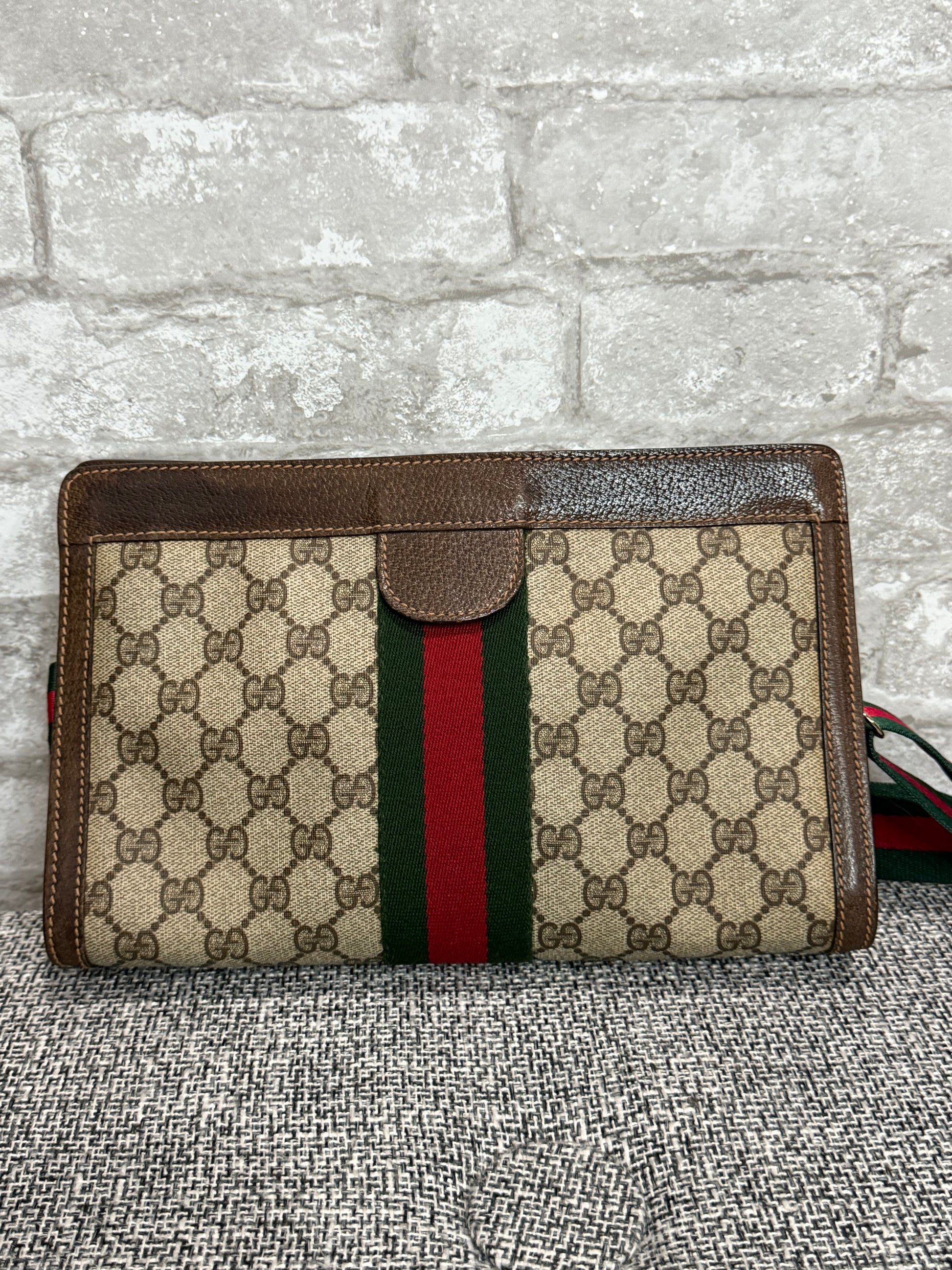 ‼️ Good condition vintage Gucci clutch turned into a crossbody bag. Added is an unbranded D-ring to connect unbranded strap to convert this authentic preloved luxury clutch into your everyday use 😍 some wear throughout, interior has minor scratch, wear. But beautiful vintage clutch/bag for everyday use!